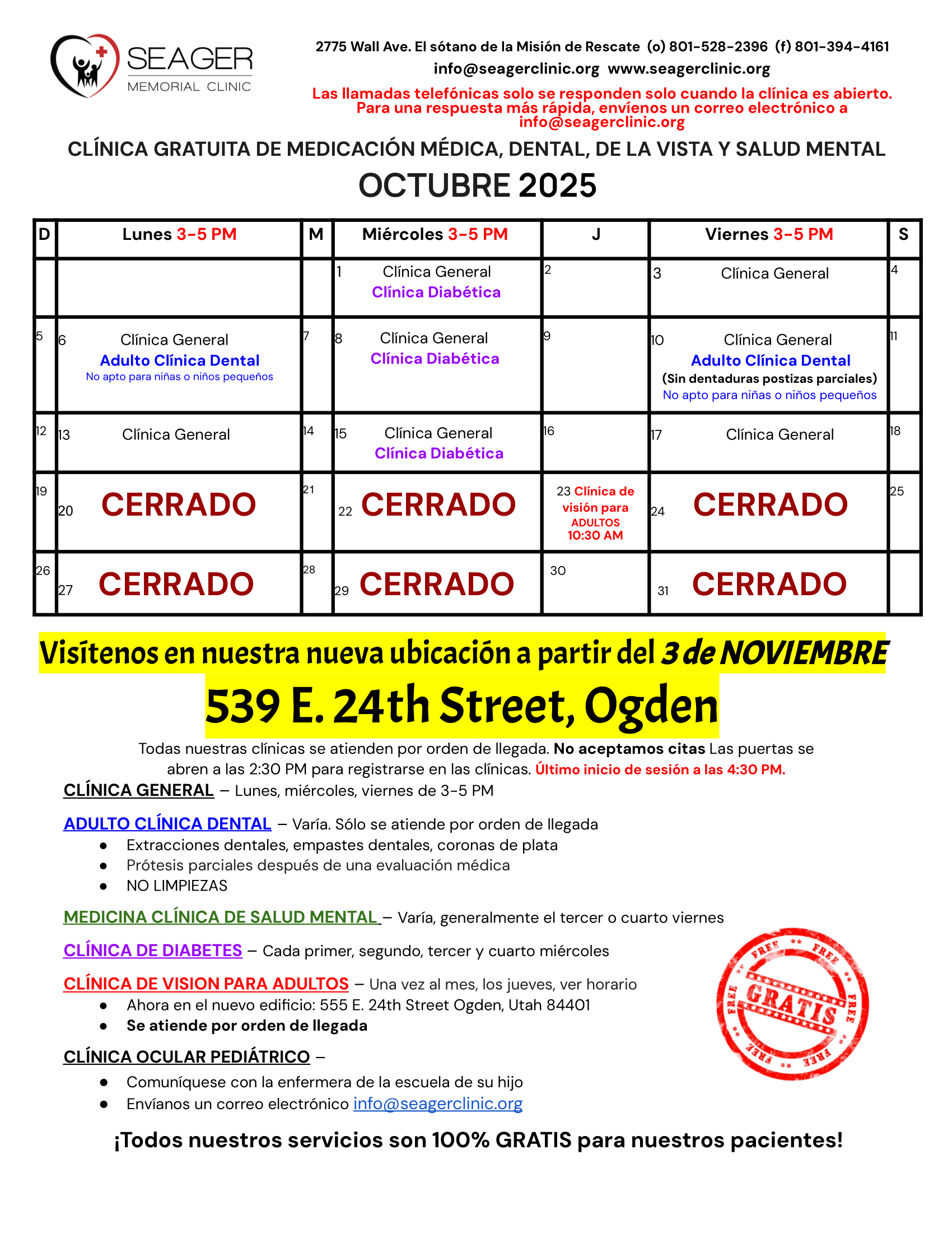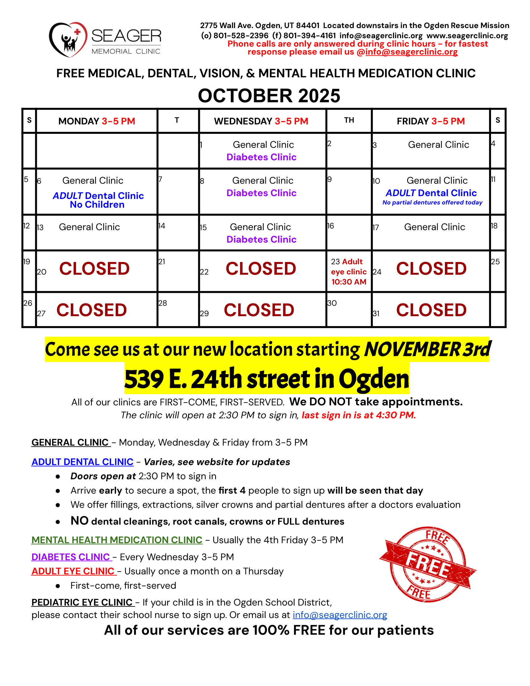 - Clinic Hours – Monday, Wednesday, & Friday from 3-5 PM (closed Holidays)